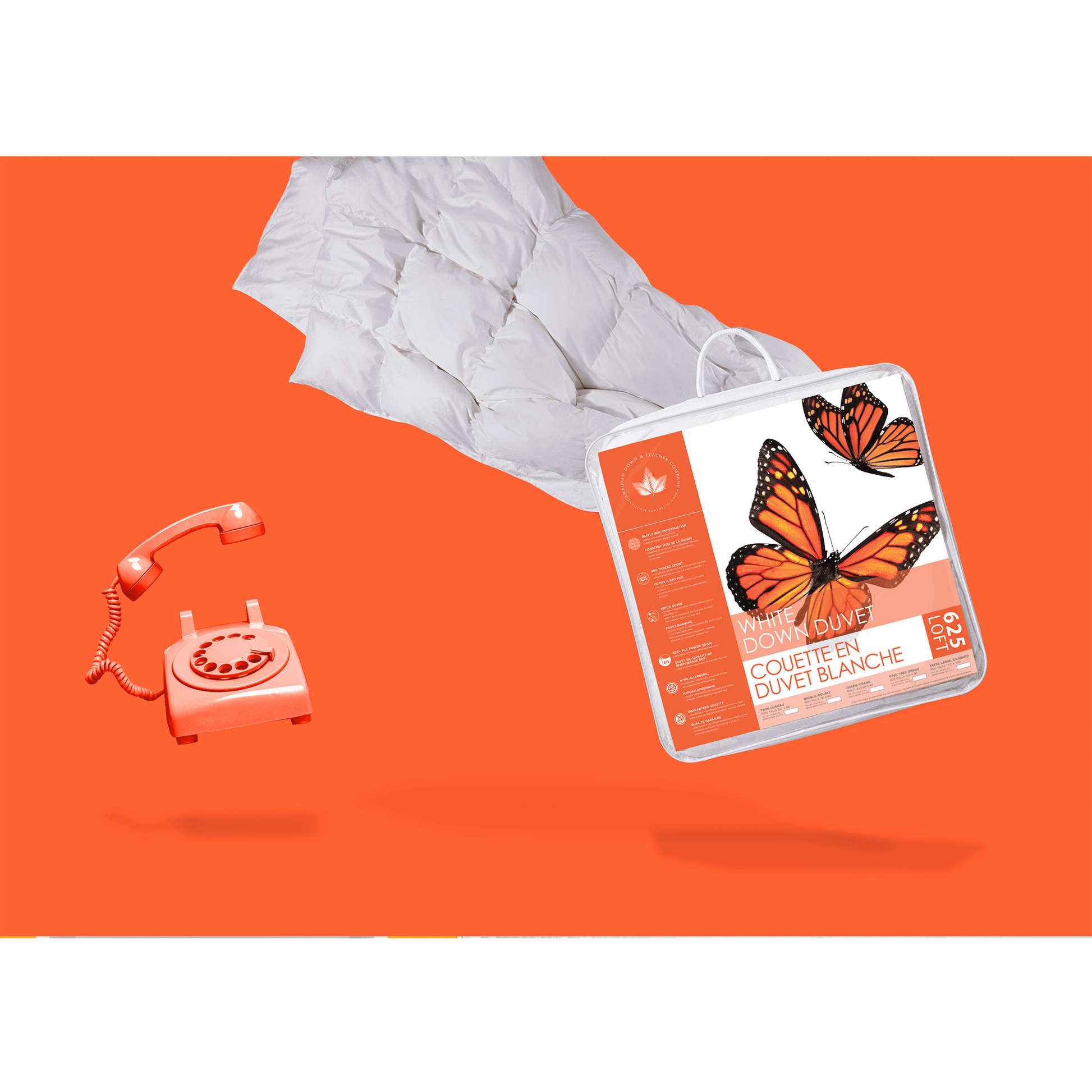 This duvet is filled with care in Canada. The cotton shell is 360 thread count, so it is soft and quiet. The duvet is filled with 625 loft duck down. Down fill is soft and luxurious, made up of tiny, fluffy clusters. This duvet is fairly lightweight, but you'll find this duvet contains more fill than a duvet with higher loft down (700 or 850). This is because the higher the loft of the down, the better the insulating properties, and the less of it we need to achieve the desired warmth level! Conversely, you'll find it has less fill than a duvet with lower loft down (550 or 575).